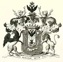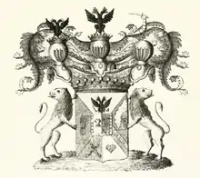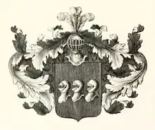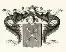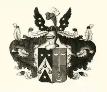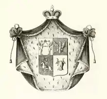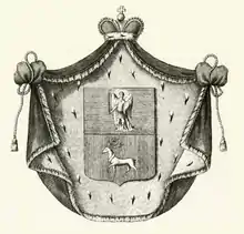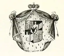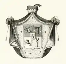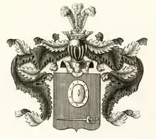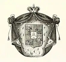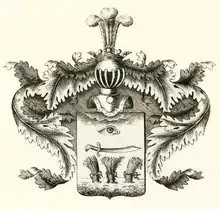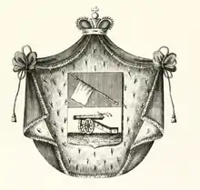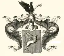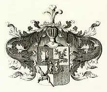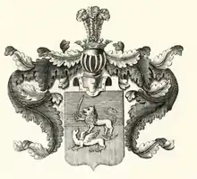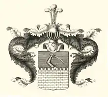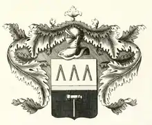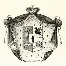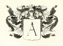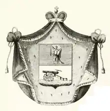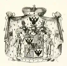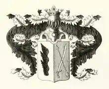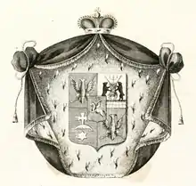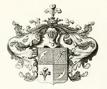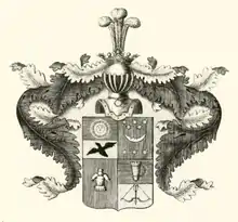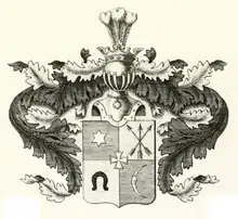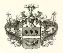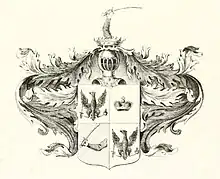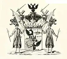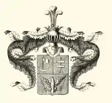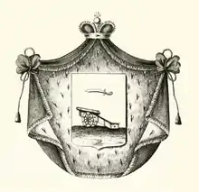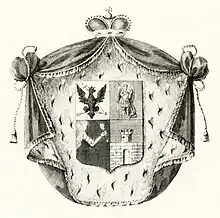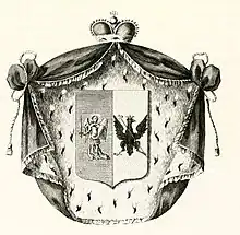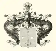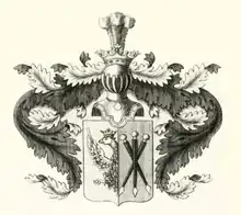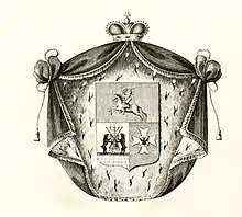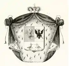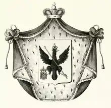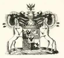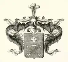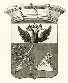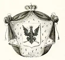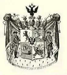 Apraxine ; olim Opraxine Maison de noblesse immémoriale[48], suivie depuis le XIVe siècle, d'origine tatare[49] et boyarde; les annales la font remonter à un prince de la Horde d'or, Solohmir-Mirza Miroslavitch[50], qui rallia en 1371 le prince de Riazan, Oleg Ivanovitch (ru) ; après son baptême sous le nom d'Ivan[51], il fut apanagé par le prince qui lui donna pour épouse sa propre sœur, Anastasia Ivanovna. Maison illustrée notamment par le général comte Pierre Matveïévitch (ru) (1659-1728), gouverneur de Saint-Pétersbourg, l'amiral comte Théodore Matveïévitch (1661-1728), créateur de la marine russe et compagnon d'armes de Pierre Ier, le comte André Matveïévitch (ru) (1663-1731), ami intime de Pierre Alexéïévitch, leur sœur, la tsarine Marthe Matveïevna (1664-1716), deuxième épouse du tsar Fiodor Alexéïévitch, le généralissime comte Stéphane Fiodorovitch (1702-1758), son fils le général comte Stéphane Stépanovitch (1757-1827), gouverneur de Smolensk, le général comte Pierre Ivanovitch (ru) (1787-1852). |