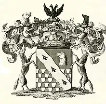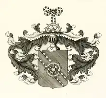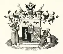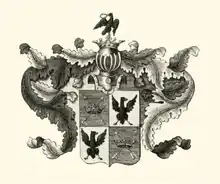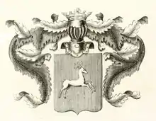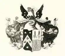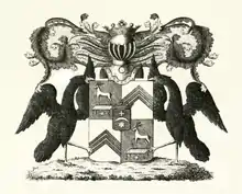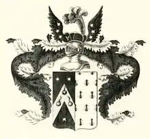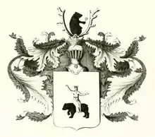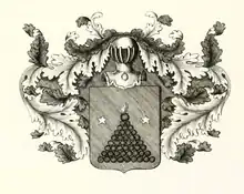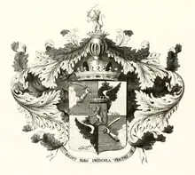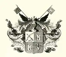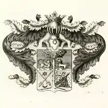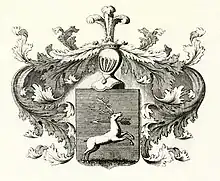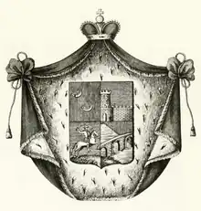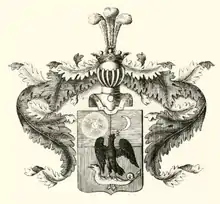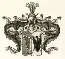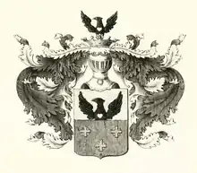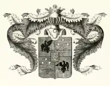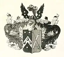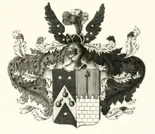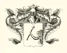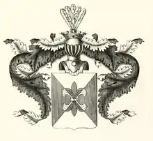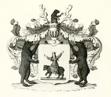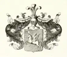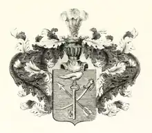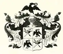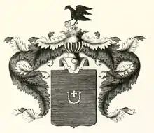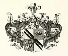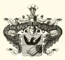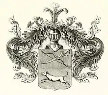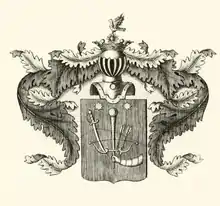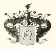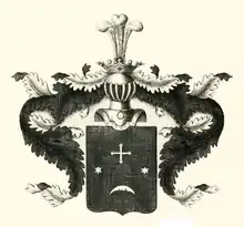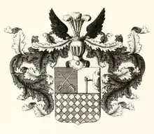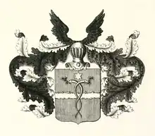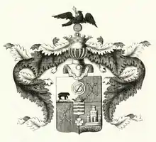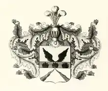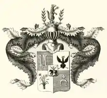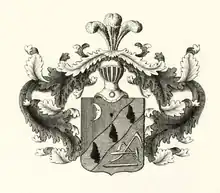 Bakhmetiev ou Bakhmetev ; olim Bakhmetieff, Bakhmetioff ou Bakhmiotoff ou Bakhmeteff Maison d'ancienne noblesse, d'origine tatare, fondée par Aslam Jérémie[66] Bakhmet, qui se mit en 1469 au service du grand-prince Vassili ; enregistrée dans la noblesse des gouvernements de Novgorod, Moscou, Penza, Saratov et Kalouga ; illustrée par le sénateur Ivan Ivanovitch (1690-1780), le colonel Jacques Khrisanfovitch[67], intime de l'empereur Pierre Alexéïevitch et commandant de la forteresse Pierre-et-Paul, la comtesse[68] Varvara Alexéïévna, épouse Protassova, (1770-1847), préceptrice des enfants de l'empereur Alexandre Pavlovitch, les frères généraux Nicolas Nikolaïévitch (1772-1831) et Alexis Nikolaïévitch[69] (1774-1841), tous deux commandants de l'Armée impériale, le fils de ce dernier, le général comte[70] Nicolas Alexeïévitch Protassoff-Bakhmétieff (ru) (1834-1907), gouverneur d'Astrakhan et ataman des Cosaques d'Astrakhan, le compositeur Nicolas Ivanovitch (ru) (1807-1891)), et l'écrivaine religieuse Alexandra Nikolaïévna (ru) (1823-1901), née Khovrina. |