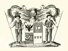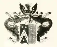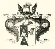 Andreïev ou Andreev (Armes concédées[45] et confirmées par lettres le à un certain Maxime Andréïévitch, fils d'un religieux de Mourom, grenadier du régiment Préobrajensky, pour sa participation au coup d'état du , qui porta sur le trône l'impératrice Elisabeth Petrovna; colonel en 1762.) |