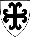 d'azur à une croix alaisée d'or, chargée d'un point de gueules en abîme, accompagnée en chef de trois besants d'argent, en pointe de deux rinceaux du même, mouvant d'un mont de trois coupeaux d'or.[4] |