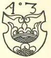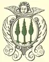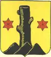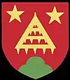 de gueules à deux écôts d'or passés en sautoir (accompagnés de trois étoiles du même, une en chef et deux aux flancs, et d'un mont de sinople à trois coupeaux issant en pointe).[2] |
