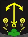 de gueules à la herse trianguaire d'or, accompagnée de deux étoiles du même et en pointe d'un mont de trois coupeaux de sinople.[9] |