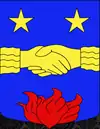 d'azur à la fasce d'or chargée d'une équerre et de deux étoiles de gueules.[9],[4] |
