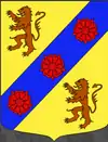 d'azur à deux chevrons d'or accompagnés en chef d'une croisette du même, en pointe d'un lion d'or issant armé et lampassé de gueules. (Il s'agissait auparavant d'un seul chevron croiseté)[12] |