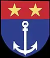 d'azur à l'ancre d'argent au chef cousu de gueules, chargé de deux étoiles d'or.[8] |
