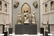 - d'une Vierge longtemps considérée comme ayant substitué au XVIe siècle la statue d'Arnolfo, mais qui serait selon les dernières études l'original modernisé à l'époque du transfert par Domenico Fontana[2],[10].