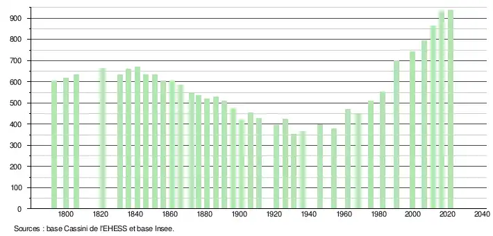 L'évolution du nombre d'habitants est connue à travers les recensements de la population effectués dans la commune depuis 1793. Pour les communes de moins de 10 000 habitants, une enquête de recensement portant sur toute la population est réalisée tous les cinq ans, les populations légales des années intermédiaires étant quant à elles estimées par interpolation ou extrapolation[19]. Pour la commune, le premier recensement exhaustif entrant dans le cadre du nouveau dispositif a été réalisé en 2006[20].