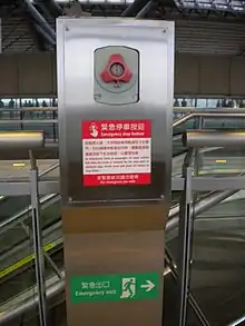 Le bouton d'arrêt d'urgence est un bouton rouge et rond, souvent sur un fond jaune, facilement discernable sur le tableau de commande ; il doit être facilement accessible par la personne. Il est appelé aussi bouton « coup de poing » car il faut une certaine force pour l'actionner mais aussi parce qu'enfoncer brutalement le bouton est un geste simple et à la portée d'une personne qui n'est pas formée à l'utilisation de la machine (dans le cas où l'opérateur ne serait pas en mesure d'effectuer le geste). En anglais, il est appelé emergency stop (ou son abréviation e-stop), kill switch ou panic button.