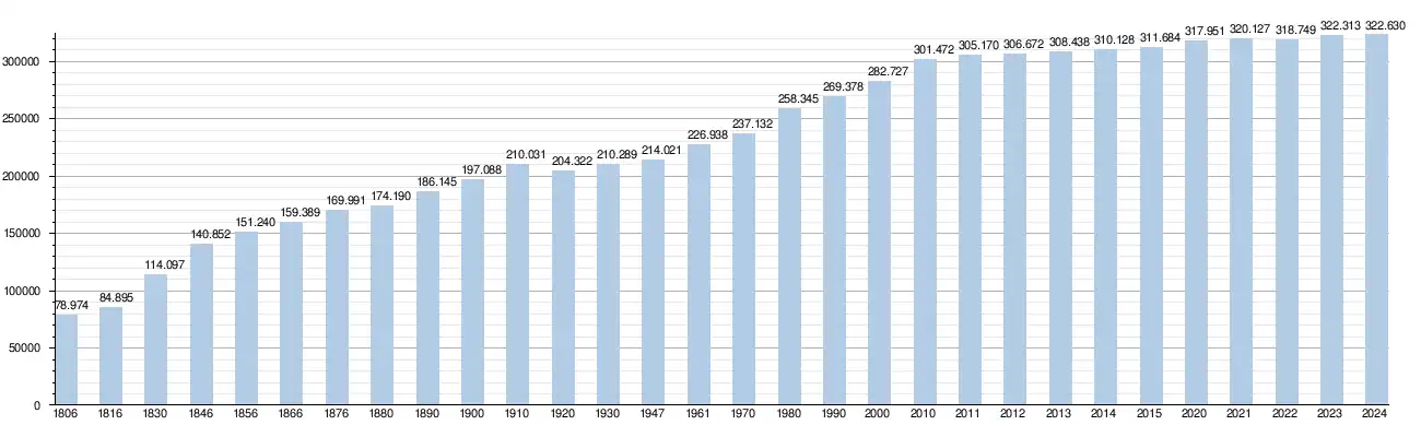 Elle comptait, au début 2024, 325 445 habitants (159 708 hommes et 165 737 femmes), soit une densité de 279,39 habitants/km2[2] pour une superficie de 1 164,85 km2.