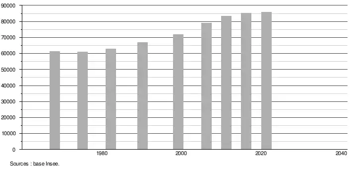 - Population municipale légale en vigueur au 1er janvier 2024, millésimée 2021, définie dans les limites territoriales en vigueur au 1er janvier 2023, date de référence statistique : 1er janvier 2021.