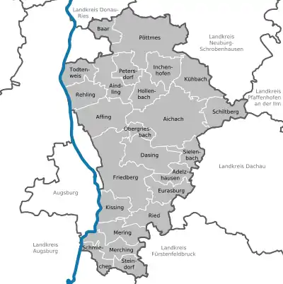 L'arrondissement d'Aichach-Friedberg est principalement rural, les seuls centres urbains sont Friedberg, Aichach et Dasing ainsi que Mering et Kissing dans le sud du territoire. À côté de ces villes ou communes, n'existent que de petits villages.