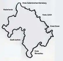 En 1971, l'arrondissement d'Aix-la-Chapelle borde dans le sens des aiguilles d'une montre au nord, en commençant par l'arrondissement du Selfkant de Geilenkirchen-Heinsberg (de) et les arrondissements de Juliers (de), Düren et Montjoie (de). Au sud-ouest, il borde la province belge de Liège et à l'ouest la province néerlandaise de Limbourg.