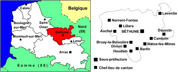 Localisation de l’arrondissent de Béthune dans la région Hauts-de-France et dans le département du Pas-de-Calais | |
