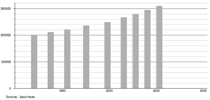 - Population municipale légale en vigueur au 1er janvier 2024, millésimée 2021, définie dans les limites territoriales en vigueur au 1er janvier 2023, date de référence statistique : 1er janvier 2021.