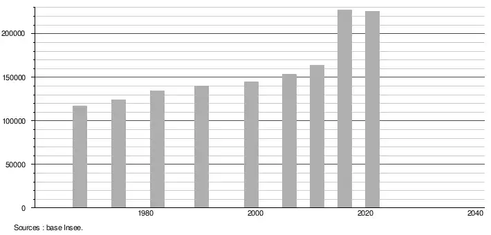 - Population municipale légale en vigueur au 1er janvier 2024, millésimée 2021, définie dans les limites territoriales en vigueur au 1er janvier 2023, date de référence statistique : 1er janvier 2021.
