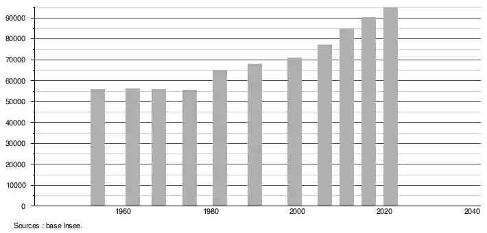 - Population municipale légale en vigueur au 1er janvier 2024, millésimée 2021, définie dans les limites territoriales en vigueur au 1er janvier 2023, date de référence statistique : 1er janvier 2021.