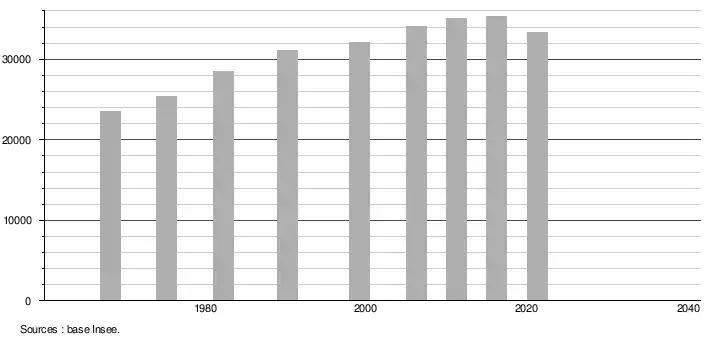 - Population municipale légale en vigueur au 1er janvier 2024, millésimée 2021, définie dans les limites territoriales en vigueur au 1er janvier 2023, date de référence statistique : 1er janvier 2021.