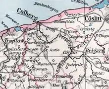 La société de chemin de fer Altdamm-Colberg (de) établit une liaison directe avec Stettin via Naugard en 1882. À partir de 1899, il relie également Colberg à la capitale du district Köslin.