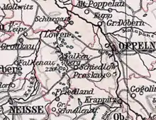 Dans la principauté d'Oppeln, l'une des sous-principautés silésiennes, des arrondissements prussiens sont formés à partir des anciens faubourgs silésiens, dont l'arrondissement de Falkenberg[3],[4]. L'arrondissement de Falkenberg est initialement subordonné à la Chambre de la guerre et du domaine de Breslau et est affecté au district d'Oppeln dans la province de Silésie au cours des réformes Stein-Hardenberg.