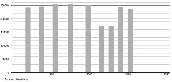 - Population municipale légale en vigueur au 1er janvier 2024, millésimée 2021, définie dans les limites territoriales en vigueur au 1er janvier 2023, date de référence statistique : 1er janvier 2021.
