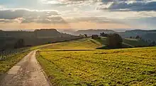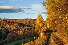 Ancien chemin rural dans l'aire protégée de « Schmidbachtal – Oberes Bottwartal mit Seitentälern und umgebenden Gebietsteilen » près de Beilstein (Bade-Wurtemberg), dans l'arrondissement de Heilbronn. Au centre, un tremble. Novembre 2018.