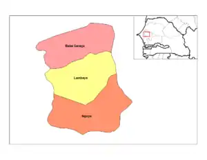 Carte des arrondissements du département de Bambey. L'arrondissement de Lambaye est au centre.