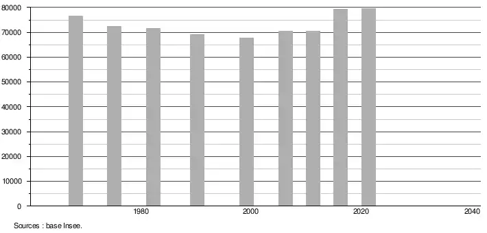 - Population municipale légale en vigueur au 1er janvier 2024, millésimée 2021, définie dans les limites territoriales en vigueur au 1er janvier 2023, date de référence statistique : 1er janvier 2021.