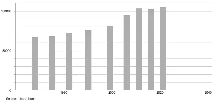 - Population municipale légale en vigueur au 1er janvier 2024, millésimée 2021, définie dans les limites territoriales en vigueur au 1er janvier 2023, date de référence statistique : 1er janvier 2021.