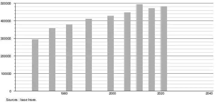 - Population municipale légale en vigueur au 1er janvier 2024, millésimée 2021, définie dans les limites territoriales en vigueur au 1er janvier 2023, date de référence statistique : 1er janvier 2021.