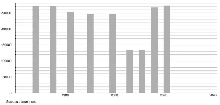 - Population municipale légale en vigueur au 1er janvier 2024, millésimée 2021, définie dans les limites territoriales en vigueur au 1er janvier 2023, date de référence statistique : 1er janvier 2021.