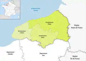 | Arrondissement de Dieppe | 761 | 3 120,10 | 232 559 (2021) | 75 | |