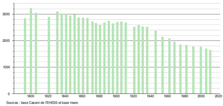 L'évolution du nombre d'habitants est connue à travers les recensements de la population effectués dans la commune depuis 1793. À partir du , les populations légales des communes sont publiées annuellement dans le cadre d'un recensement qui repose désormais sur une collecte d'information annuelle, concernant successivement tous les territoires communaux au cours d'une période de cinq ans. Pour les communes de moins de 10 000 habitants, une enquête de recensement portant sur toute la population est réalisée tous les cinq ans, les populations légales des années intermédiaires étant quant à elles estimées par interpolation ou extrapolation[14]. Pour la commune, le premier recensement exhaustif entrant dans le cadre du nouveau dispositif a été réalisé en 2005[15],[Note 2].
