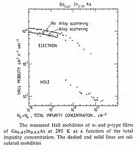 La mobilité des électrons et la mobilité des trous sont des paramètres clé pour la conception et la performance des composants électroniques. Takeda et al furent les premiers à mesurer la mobilité des électrons de films épitaxiaux de InGaAs déposés sur des substrats InP[9]. Des mesures de mobilité des électrons et des trous sont montrées en Figure 4.