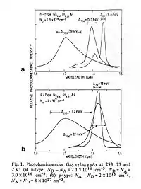 La largeur de bande interdite de GaInAs peut être déterminée à partir du pic du spectre de photoluminescence, pourvu que la concentration totale en impuretés et en défaut soit inférieure à 5 × 1016 cm−3. La largeur de bande interdite dépend de la température et croît lorsque la température diminue, comme peut le voir sur la Fig. 3 sur des échantillons de types n et p. La largeur de bande interdite à température ambiante est de 0,75 eV et se situe entre celle de Ge et de Si. Il se trouve que la largeur de bande interdite de GaInAs est parfaitement adaptée pour les photodétecteurs et les applications laser sur la fenêtre de transmission à longueur d'onde élevée (bandes C et L), pour les télécommunications par fibre optique.