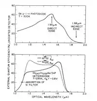 La principale application de GaInAs concerne les détecteurs infrarouge. La réponse spectrale d'une photodiode GaInAs est présentée en Figure 5. Les photodiodes GaInAs constituent le choix préféré sur la plage de longueur d'onde 1,1 µm < λ < 1,7 µm. Par exemple, comparées aux photodiodes en Ge, les photodiodes GaInAs ont un temps de réponse plus rapide, une meilleure efficacité quantique et un courant d'obscurité plus faible pour la même surface de capteur[16]. Les photodiodes GaInAs furent inventées en 1977 par Pearsall[17].