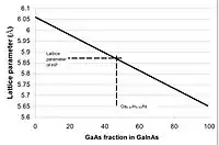 Le paramètre cristallin de InGaAs augmente linéairement avec la concentration de InAs dans l'alliage[7]. Le diagramme de phase liquide-solide[3] montre que lors de la solidification à partir d'une solution contenant du GaAs et du InAs, GaAs est incorporé beaucoup plus rapidement que InAs, appauvrissant la solution en GaAs. Lors de la croissance d'un lingot à partir d'une solution, la composition du premier matériau à solidifier est riche en GaAs tandis que le dernier matériau à solidifier est enrichi en InAs. Cette caractéristique a été exploitée pour produire des lingots de InGaAs avec un gradient de composition selon la longueur du lingot. Cependant, les déformations introduites par le paramètre cristallin variable fait que le lingot est polycristallin et limite la caractérisation à quelques paramètres, tels que la bande interdite et le paramètre cristallin avec des incertitudes dues au gradient de composition dans ces échantillons.