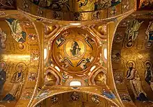L'art religieux n'est cependant pas limité à la décoration monumentale des intérieurs d'églises. L'un des principaux genres de l'art byzantin est l'icône, une image du Christ, de la Vierge, ou d'un saint, objets de vénération dans les églises orthodoxes et les maisons privées. Les icônes sont de nature religieuse, en particulier après la fin de l'iconoclasme, elles sont assimilées à la manifestation de la «présence» unique du personnage représenté par le biais d'une «ressemblance» soigneusement entretenue par les canons de la représentation[8]. L'art religieux byzantin est pénétré des lois du hiératisme[9] (compositions qui obéissent à une stricte frontalité, avec une certaine rigidité des figures)[10].
