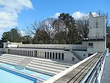 - La façade présente une alternance de pierre de taille (soubassement, linteaux et corniches), de céramique brique et de bois peint pour les éléments saillants. Entre les niveaux, des cartouches encadrent des carreaux émaillés portant inscription « Établissement Municipal, bains chauds, hydrothérapie ». À chaque extrémité de la façade, les hauts cartouches sont décorés de guirlandes de fleurs avec nœuds et losanges.