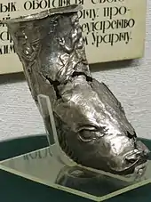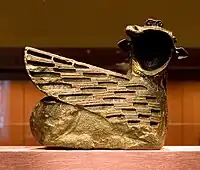 ![]() | ![]() | Les rhytons en argent de l'époque des Achéménides associent des éléments orientaux de la Grèce antique et d'autres de l'art d'Urartu. Cet aspect a permis aux scientifiques de parler de l'influence de l'art d'Urartu sur celui de la Perse[19]. |