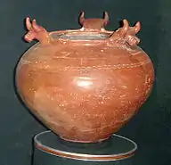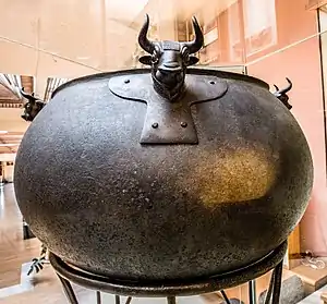 | À gauche, un chaudron avec des figures de taureaux, découvert dans le raïon de Vana. Au-dessus, un chaudron découvert dans des fouilles en Phrygie en Turquie occidentale, mais qui est classé malgré tout parmi les découvertes dans l'art Urartu. Cette figurine qui décore le chaudron est probablement une représentation du dieu d'Urartu du soleil appelé Chivini[2]. |
