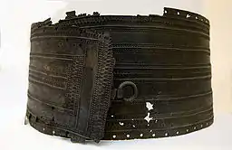 | Restes d'une ceinture en métal d'Urartu, découverts lors de fouilles dans la ville d'Erebouni sur la colline d'Arin Berd. Ils sont conservés au musée Erebouni à Erevan. | Ceinture en bronze d'Urartu, découverte dans la région de Van (Turquie). Conservée au musée des civilisations anatoliennes à Ankara. |