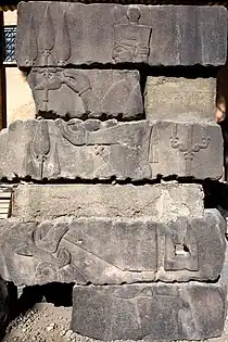 | À gauche: Vestiges d'un bas-relief important en pierre avec une représentation de la déesse Teisheba, debout sur un taureau. Il a été découvert dans les ruines de la citadelle d'Adildjevaz, et conservés au Musée de Van; Au-dessus: Deux coffrets en pierre découverts lors des fouilles de Karmir-Blourе. Conservés au musée Erebouni à Erevan. À droite : représentation d'un griffon et d'un disque ailé. | ||||