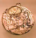 | Parure féminine en argent (pectoral) avec une représentation du dieu Haldi (sur le trône) et son épouse, la déesse urartienne Arubani. Le pectoral est conservé par un musée de Berlin. | Couvercle de chaudron en argent garni d'une figure représentant une grenade. Mentionné comme propriété du tsar Argishti Ier, Musée d'histoire de l'Arménie. |