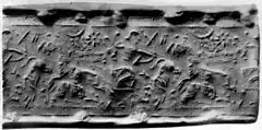 | Les sceaux cylindriques représentent traditionnellement des motifs cosmiques ou religieux, moins souvent des scènes de chasse. Sur les échantillons présentés ce sont des représentations de la lune, des étoiles, des archers en train de viser et parfois l'Arbre de vie. | ||