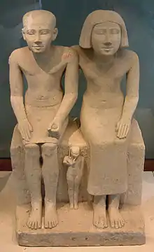 Les statues de particuliers sont généralement de plus petite taille, à l'exception du groupe de Sépa et Nésa. Si celles de la IVe dynastie possèdent plutôt un visage globulaire et un corps musclé, la tendance sous la Ve dynastie est au réalisme. Le visage quant à lui se doit d'être assez fidèle au modèle, car il contient une réalité magique : enfermées dans un serdab, les statues sont censées recevoir le Ba, l'âme du défunt, en quelque sorte. On remarque les traces de fard vert sous les yeux de la jeune femme : cette couleur est caractéristique des maquillages de la troisième dynastie. Ensuite, les fards prendront la couleur noire (khôl).