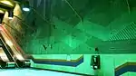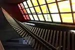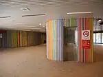| Mousseau, Jean-Paul | Murale | 1976 | Plastique laminé, verre trempé | Alternance de 11 panneaux de plastique laminé verticaux jaunes et verts et décorés d'un motif triangulaire stylisé qui semble indiquer une direction. | ![]() | ||