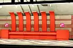 | Morelli, Michel | Bancs | 1988 | Granit, acier peint | L'œuvre consiste en une série de bancs qui s'intègre à l'architecture de la station. Les tubes d’acier rouges rappellent les porte-bagages des anciens tramways. | ![]() | ||