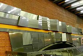 | Trudeau, Yves | Relief, négatif positif | 1986 | Acier inoxydable | Des plaques d'acier sont disposées sur le mur de la passerelle. Les plis et les différents finis créent des jeux de lumières et de couleurs. | ![]() | ||