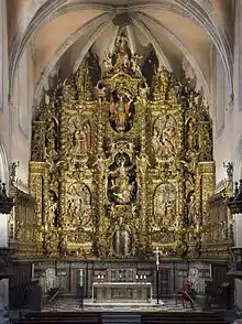 Dans la sculpture aussi, les grands maîtres viennent souvent de l'extérieur, comme Bartolomé Ordóñez (ca), de Burgos, qui œuvre sur le chœur de la cathédrale de Barcelone (1515-1520), Martín Díez de Liatzasolo (ca), auteur du Saint-Sépulcre de l'église du Saint-Esprit de Terrassa (1539-1544), le valencien Damià Forment à qui l'on doit le retable en albâtre du monastère de Poblet (1527-1529)[62]. Comme nom catalan, relevons Agustí Pujol (ca), auteur des retables du Rosier de la cathédrale de Barcelone et de l'église Sant Vicenç de Sarrià, ainsi que du retable de l'Immaculée Conception, à Verdú[63].