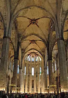 De superbes cathédrales sont érigées, comme celles de Barcelone, Tarragone, Gérone, Manresa, Solsona, Tortosa, etc., de même que de grandes églises comme Sainte-Marie-de-la-Mer et Santa Maria del Pi à Barcelone, la basilique Santa Maria de Vilafranca del Penedès (ca), l'église Saint-Jean-le-Vieux de Perpignan, celle du monastère de Pedralbes, etc. [47]. L'architecture civile connaît elle aussi un épanouissement notable, surtout dans les palais et les édifices publics, comme le Grand Palais royal (ca), le Palais de la généralité, l'Hôpital de la Sainte-Croix, les Arsenaux royaux, la Loge de mer et l'hôtel de ville (ca) à Barcelone[47].